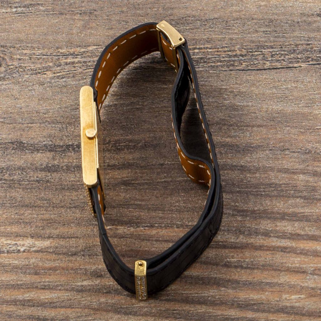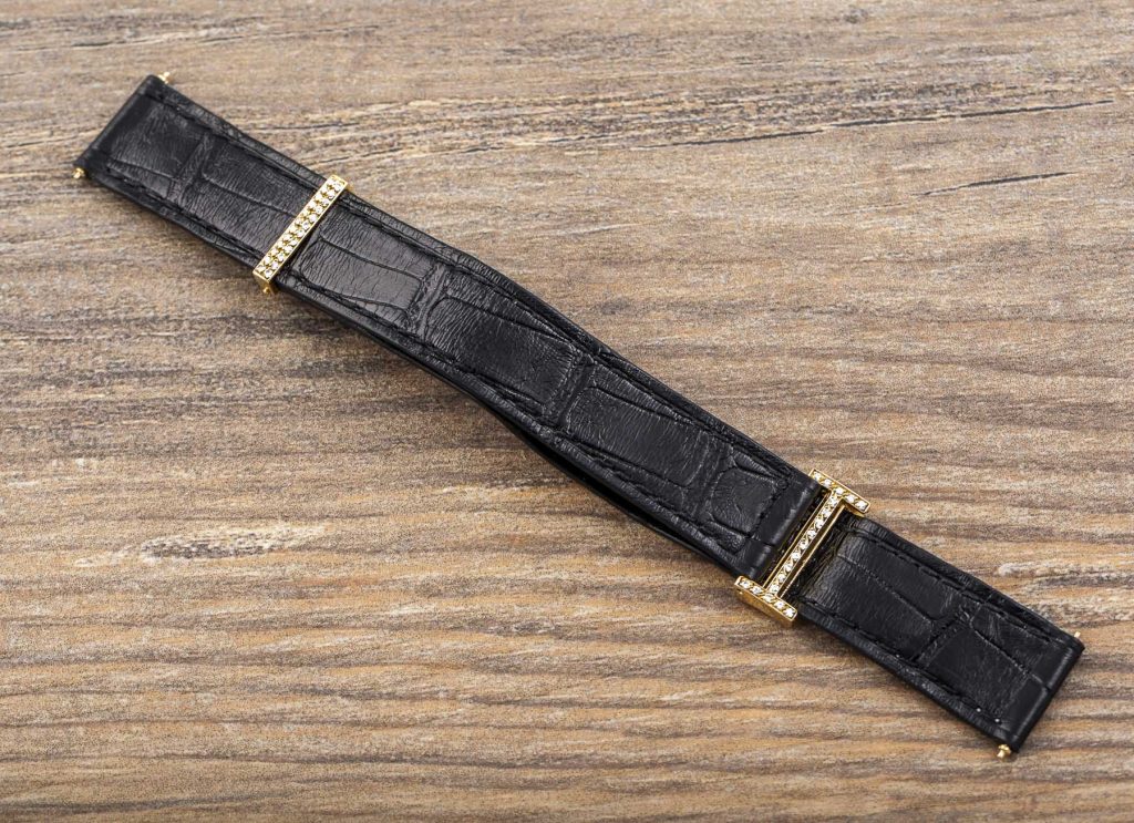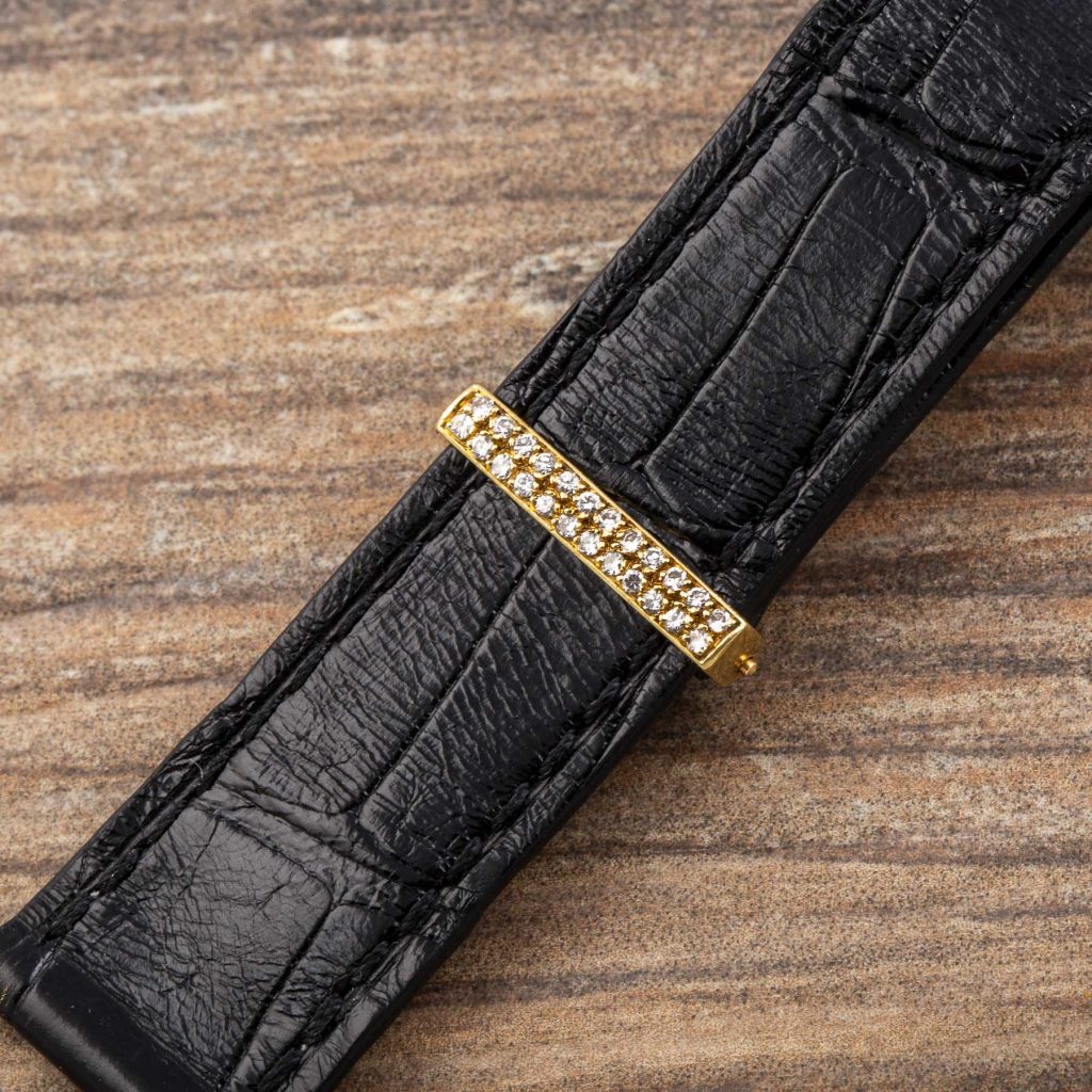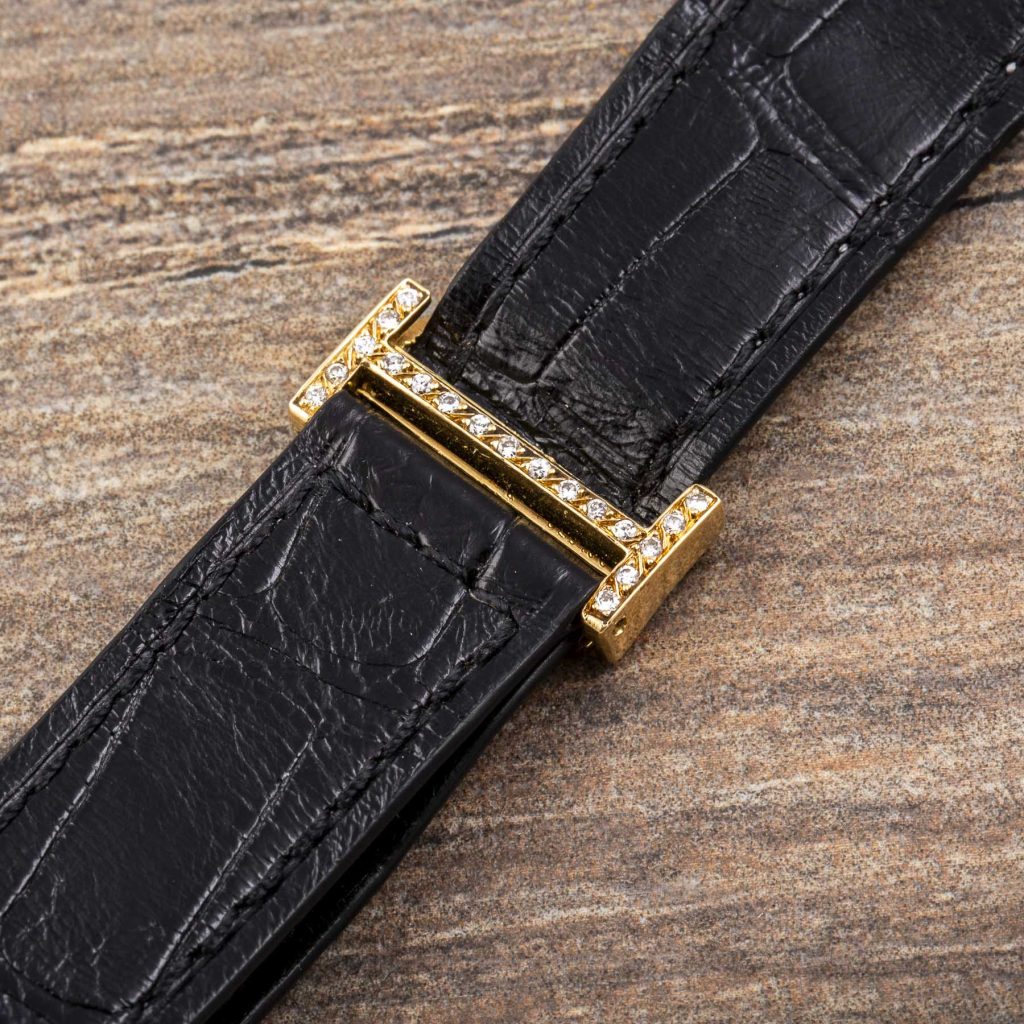 Despite its luxurious appearance, the watch remains highly wearable thanks to its balanced rectangular proportions and elegant black alligator strap, which enhances the contrast between the deep black leather and the brilliance of the diamonds.