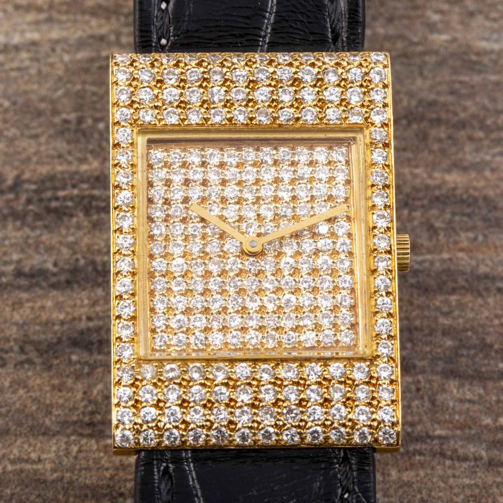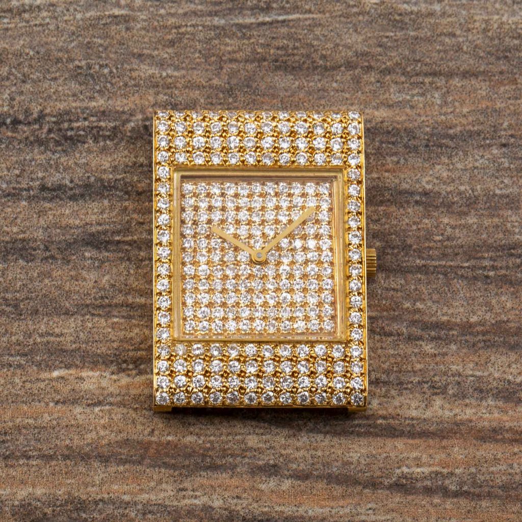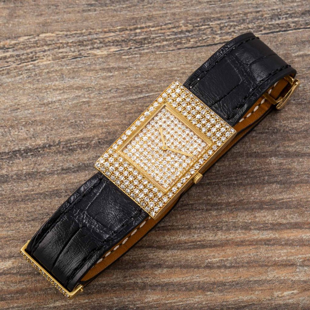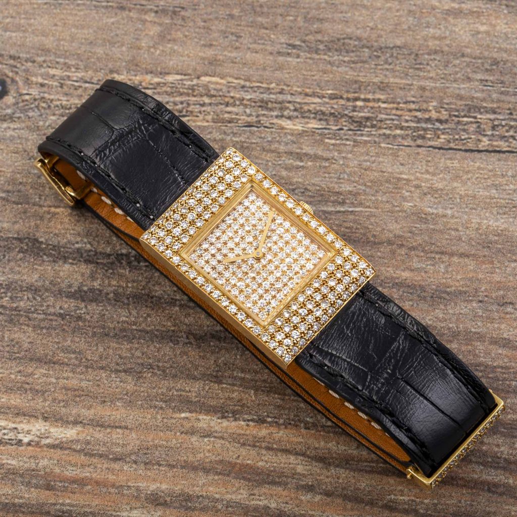 The present example represents a particularly striking interpretation of the Reflet aesthetic. Crafted in 18-karat yellow gold, the rectangular case is entirely adorned with pavé-set diamonds, creating a dazzling interplay of light across the dial, bezel, and case. The diamond-set dial continues the design seamlessly, leaving only the elegant gold hands to stand out against the shimmering surface.