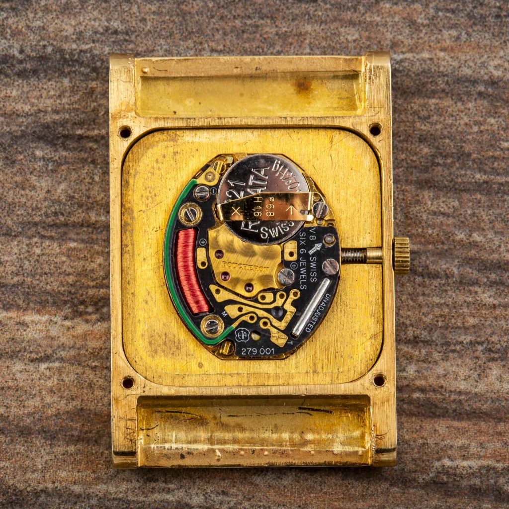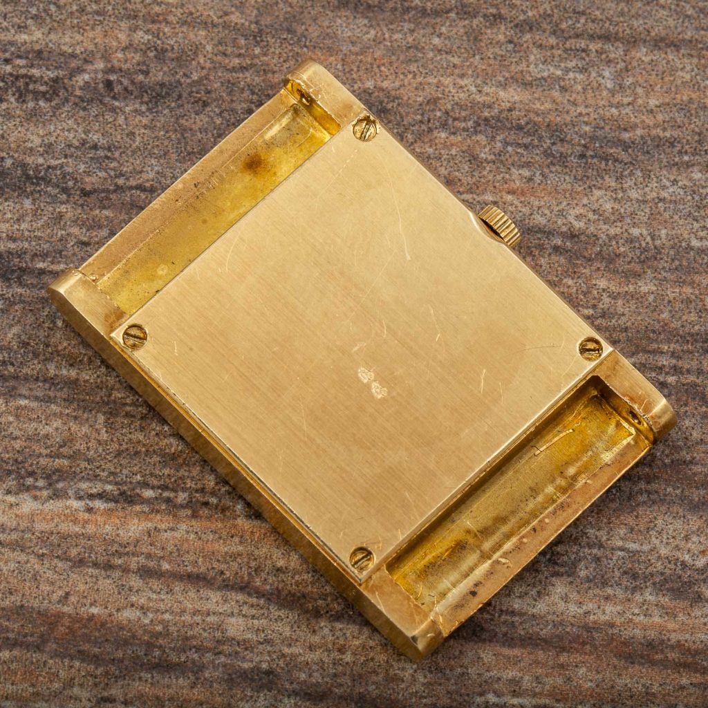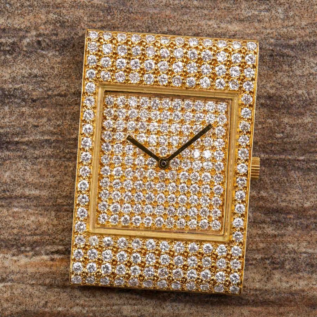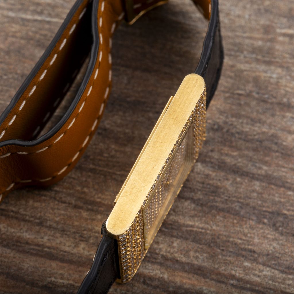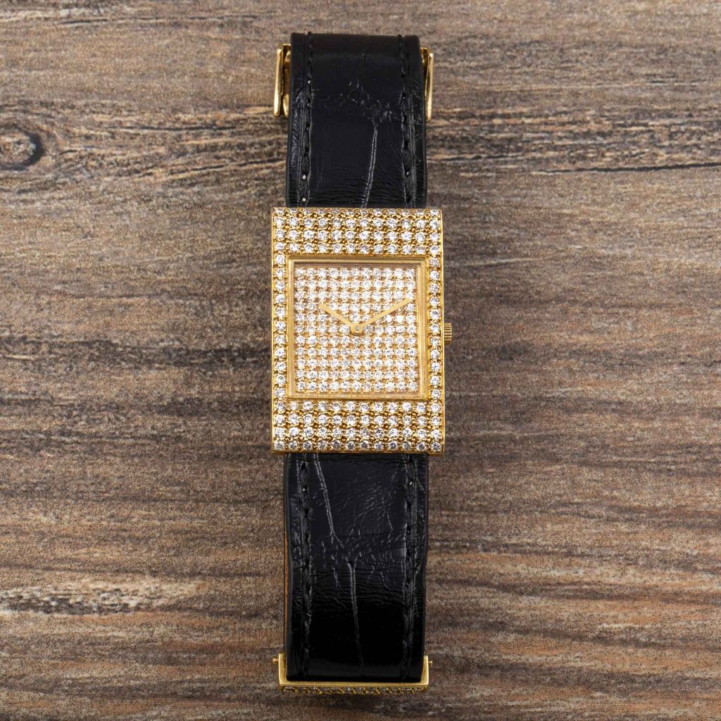 The present example represents a particularly striking interpretation of the Reflet aesthetic. Crafted in 18-karat yellow gold, the rectangular case is entirely adorned with pavé-set diamonds, creating a dazzling interplay of light across the dial, bezel, and case. The diamond-set dial continues the design seamlessly, leaving only the elegant gold hands to stand out against the shimmering surface.