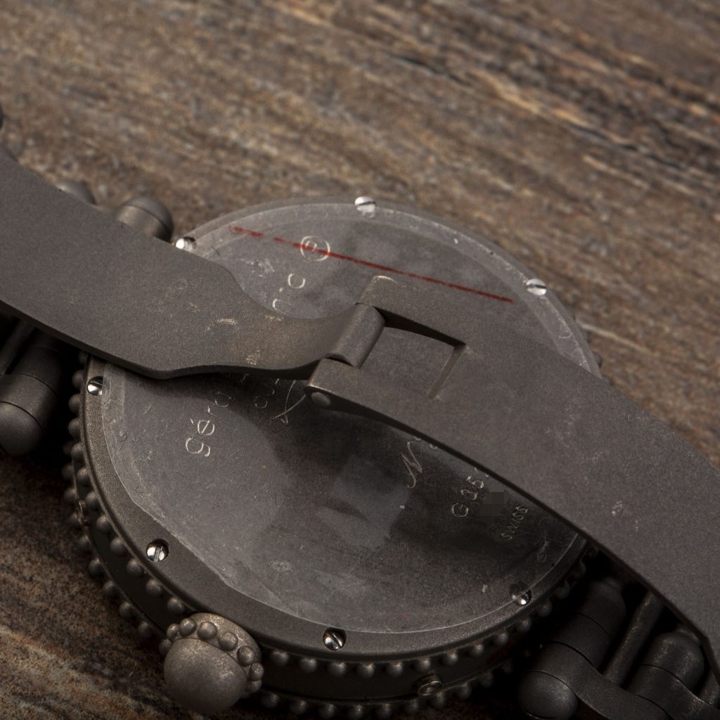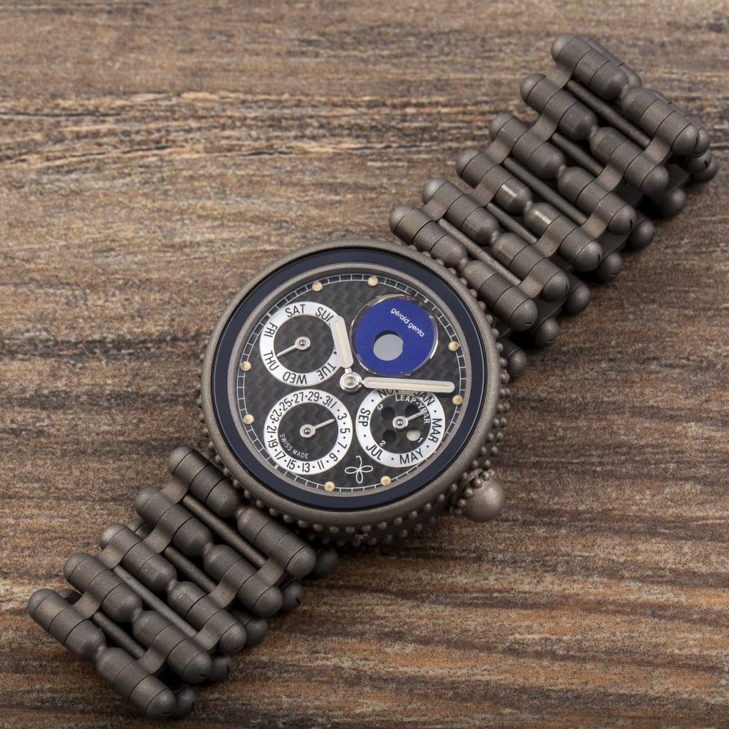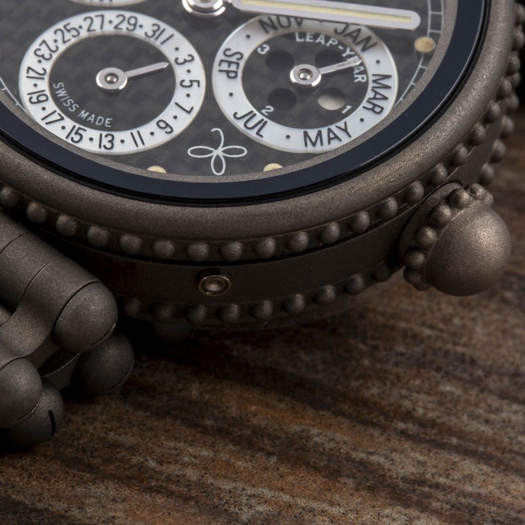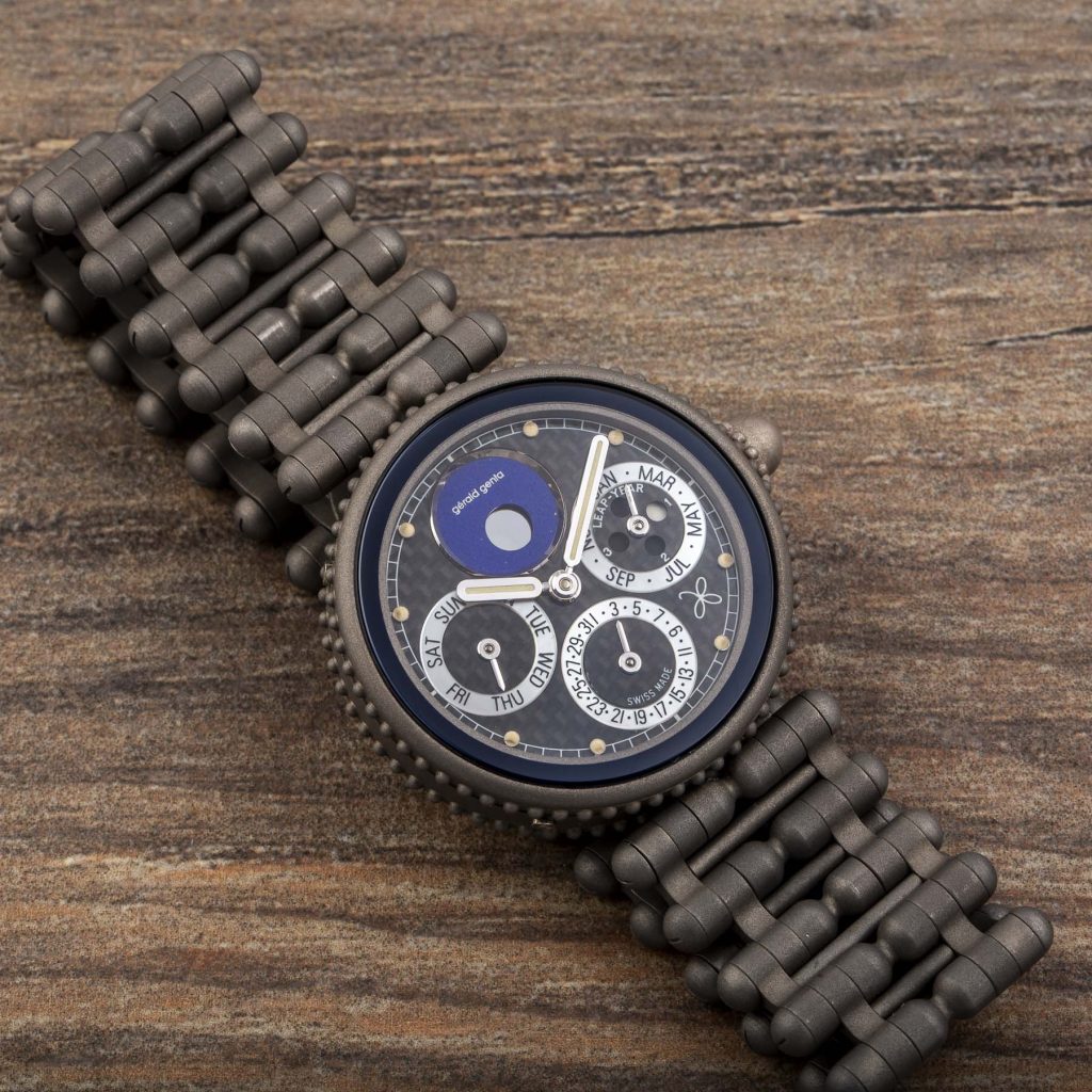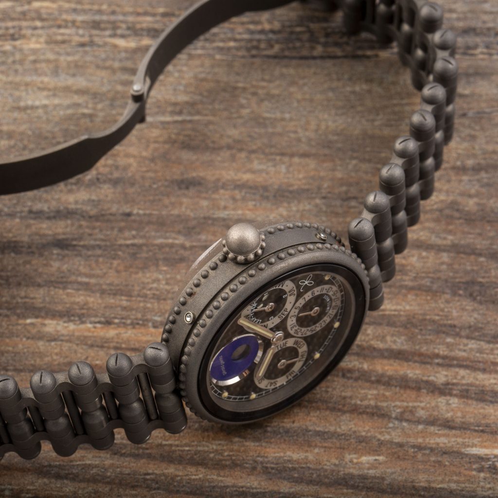 The present example belongs to this production of quartz watches with complications. It features a perpetual calendar with moonphase and is distinguished by a full titanium case paired with an integrated titanium bracelet. The grey carbon dial is further enriched by mother of pearl and lapis lazuli subdials.