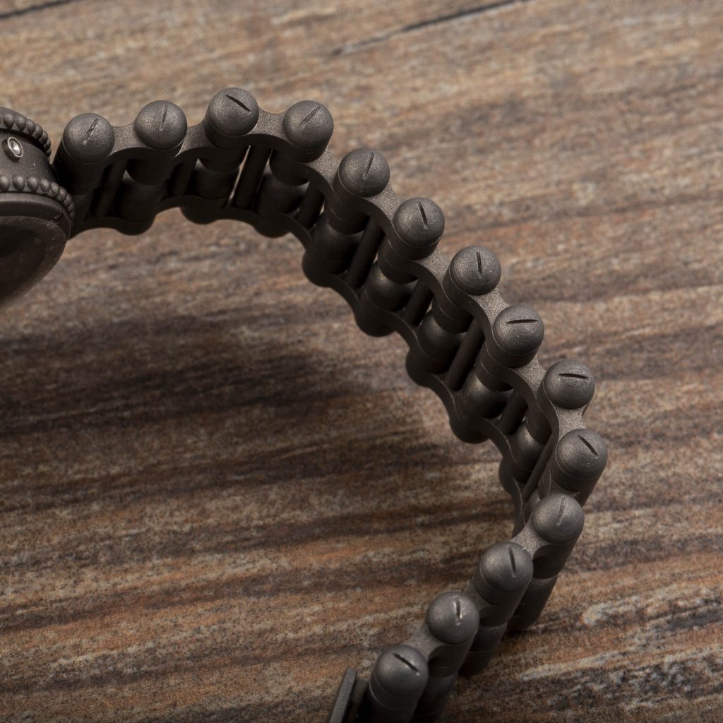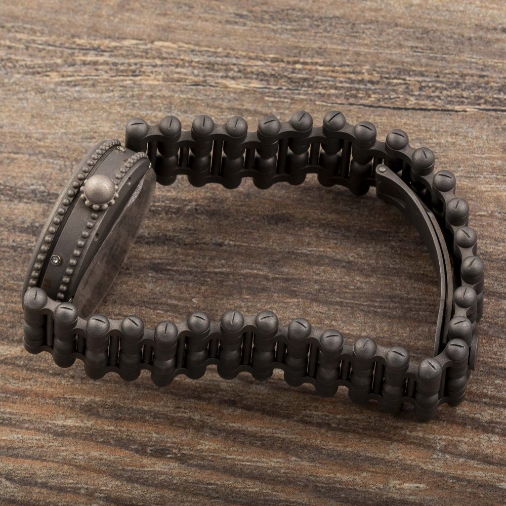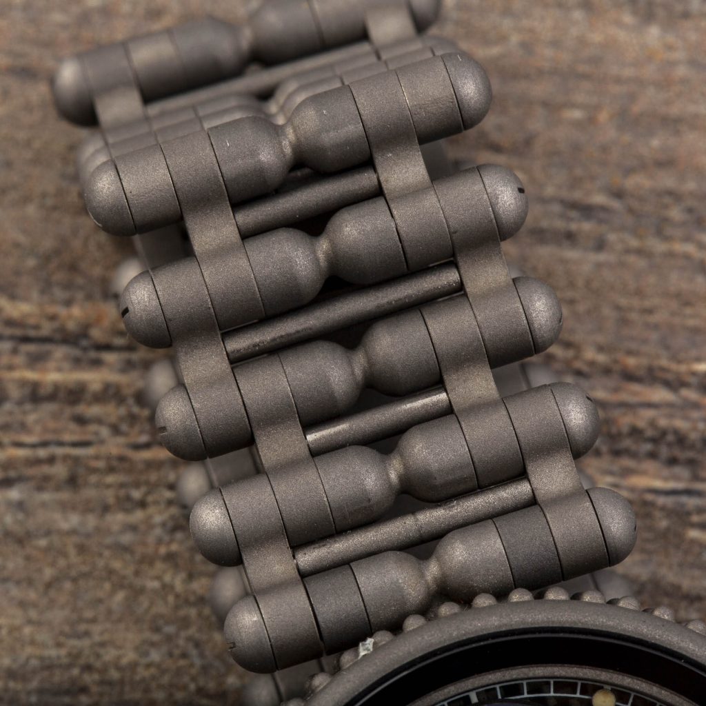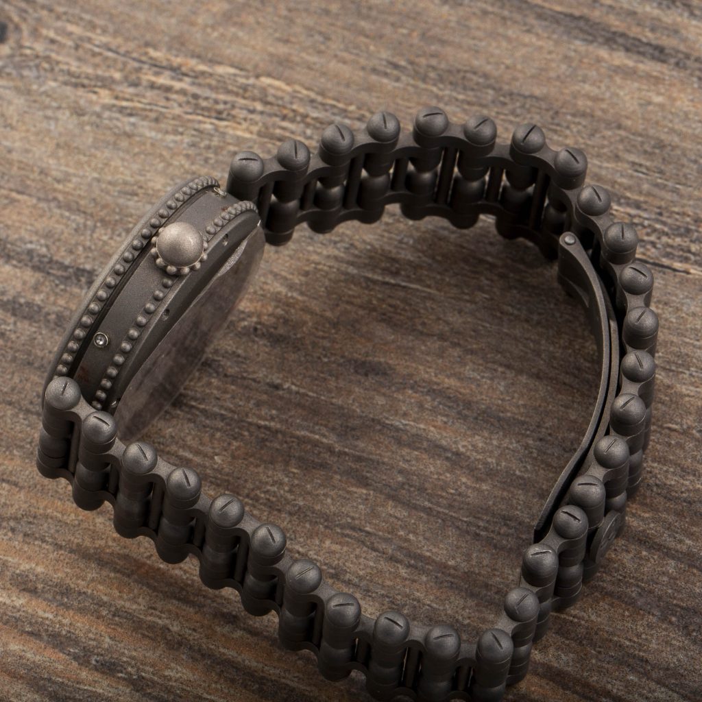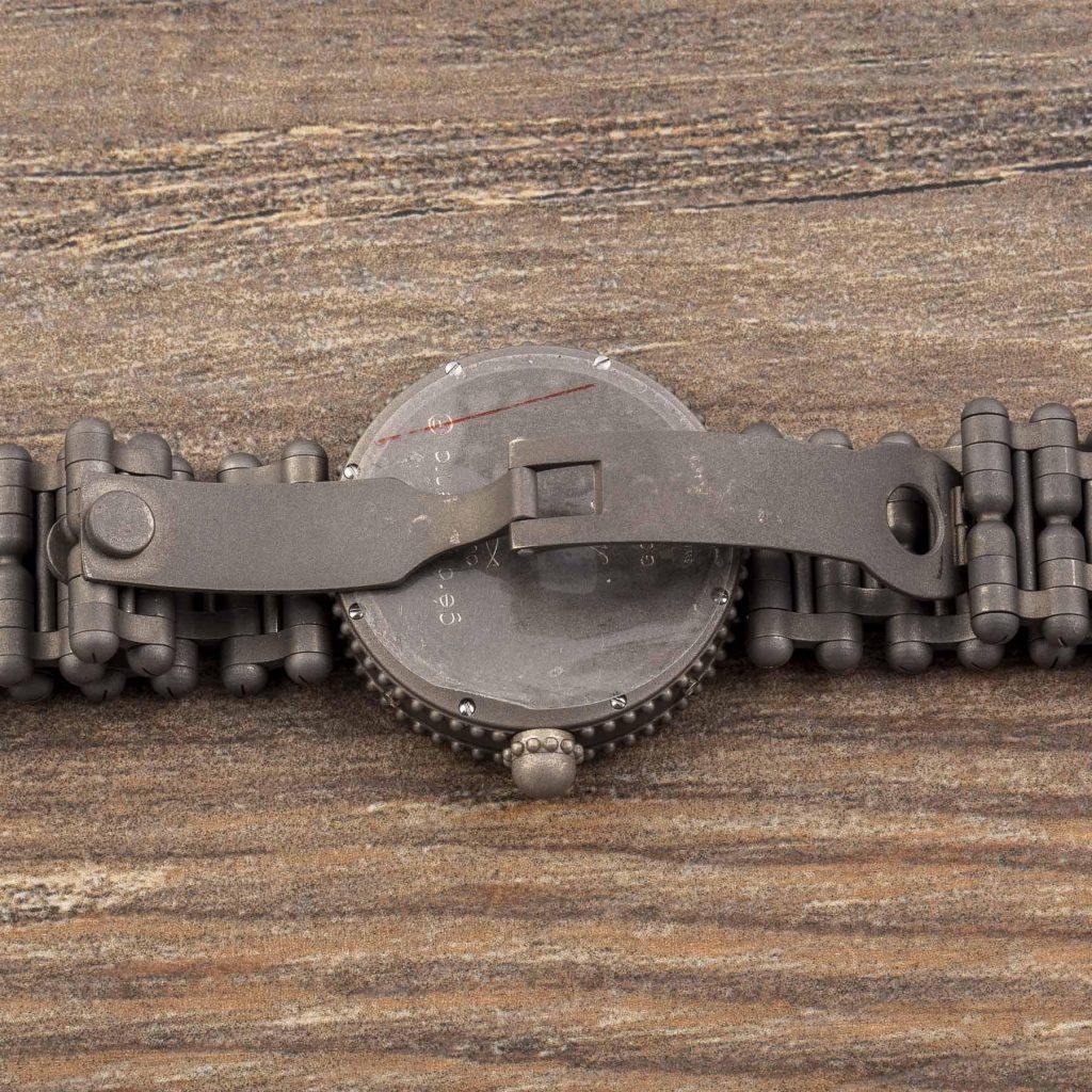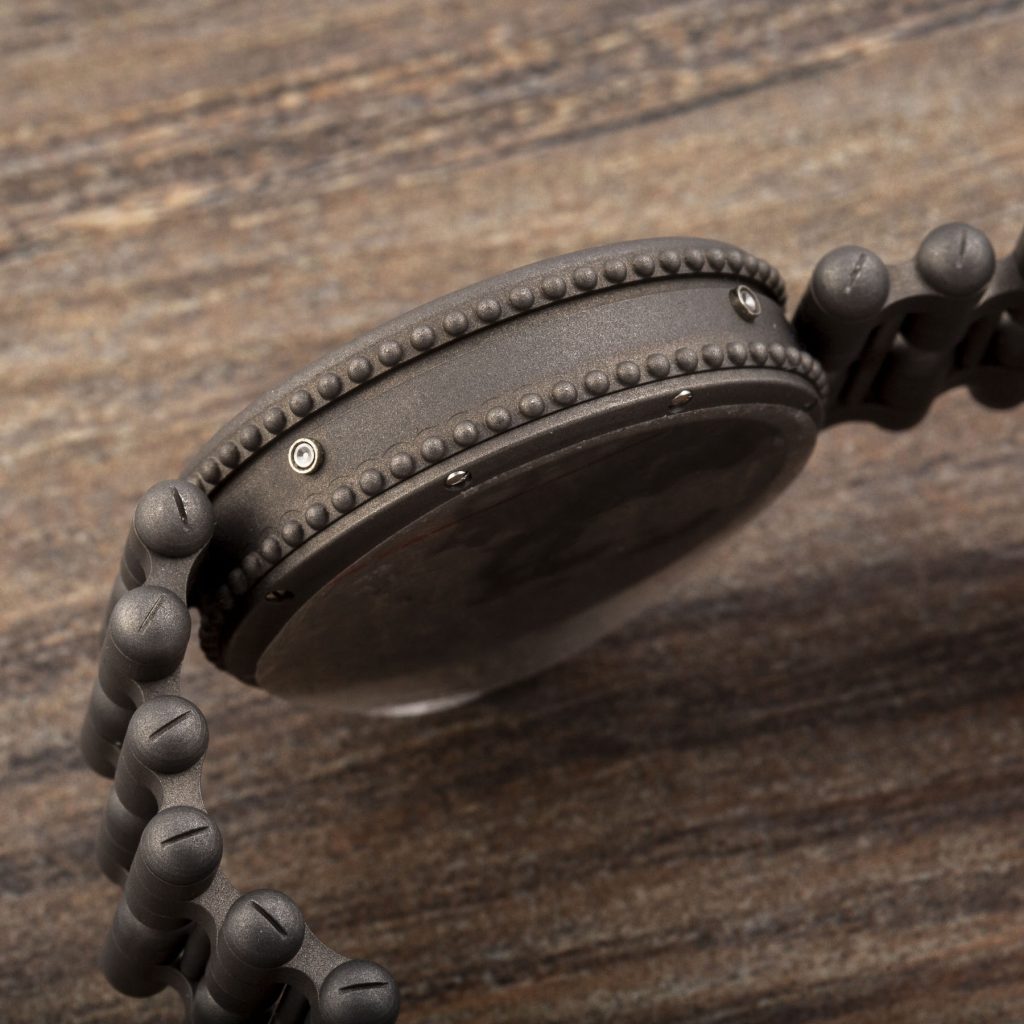 The present example belongs to this production of quartz watches with complications. It features a perpetual calendar with moonphase and is distinguished by a full titanium case paired with an integrated titanium bracelet. The grey carbon dial is further enriched by mother of pearl and lapis lazuli subdials.