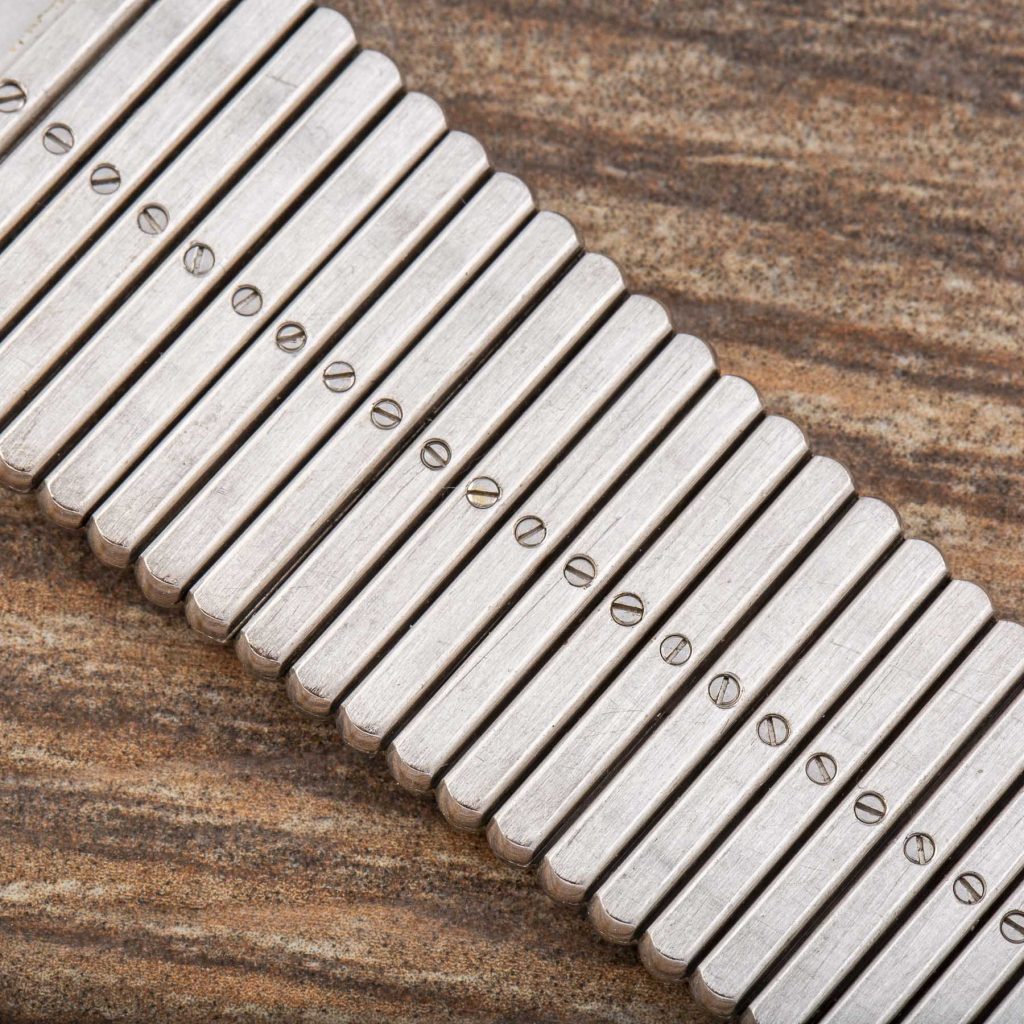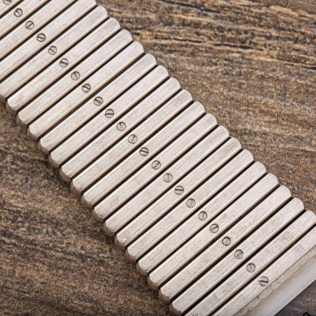 The integrated bracelet is particularly remarkable for its substantial construction and tactile presence. Composed of wide, rounded links with intricate hand-engraved finishing, it gives the watch a pronounced sense of weight and solidity on the wrist—an intentional design choice that conveys both luxury and confidence.