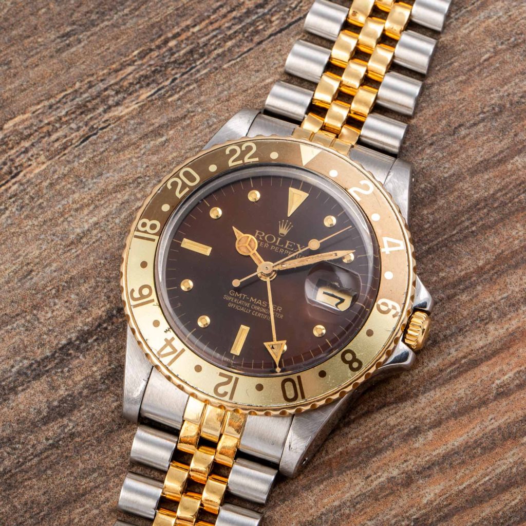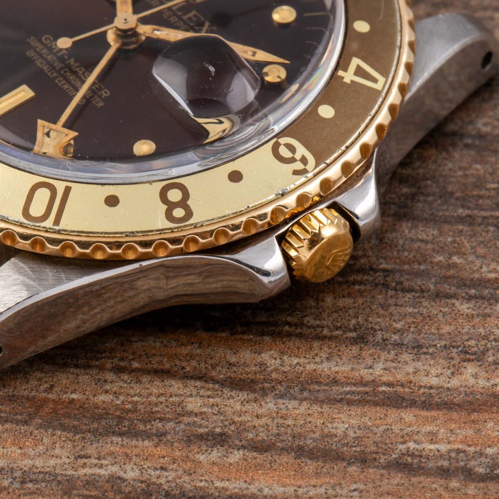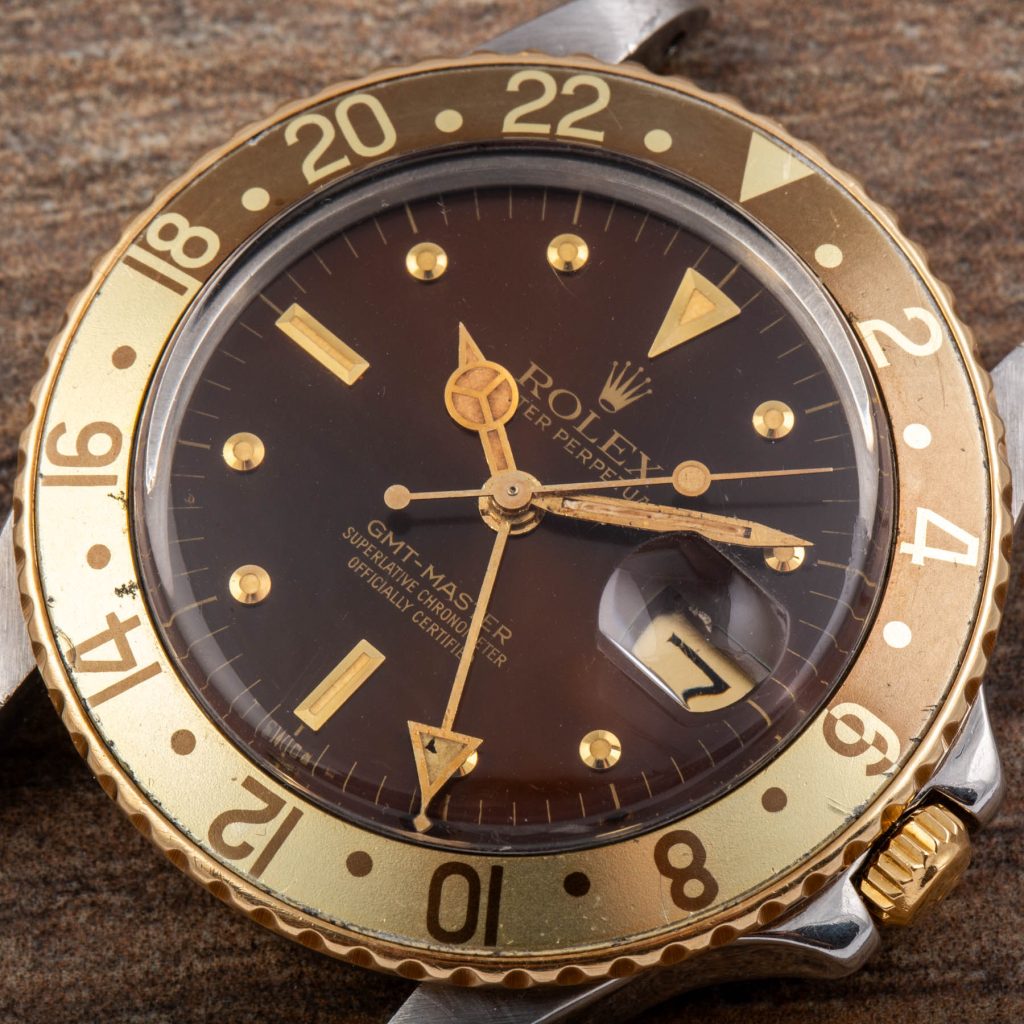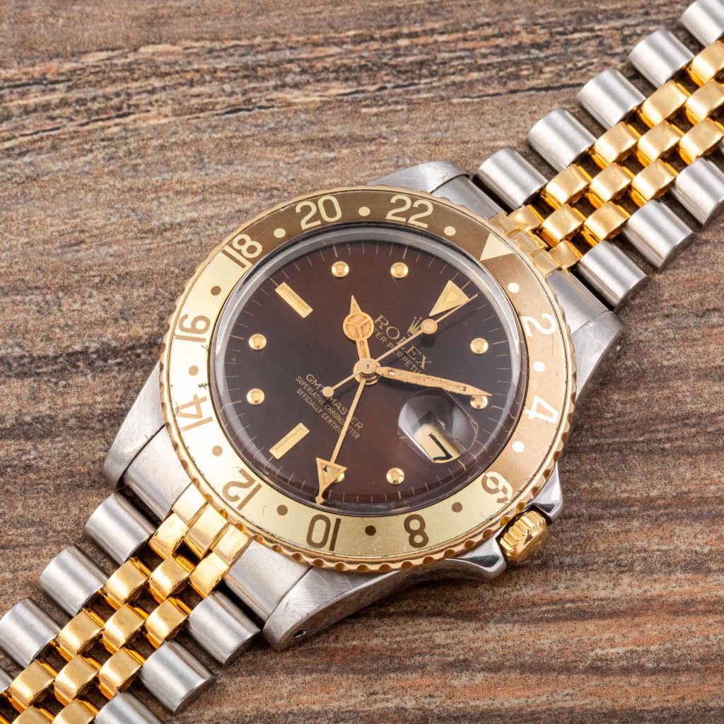 The present example is a highly attractive “Root Beer” configuration in stainless steel and yellow gold. It features the desirable brown dial with applied yellow gold “nipple” hour markers, whose raised conical shape adds depth and warmth, perfectly matching the gilt hands and brown and gold bezel insert. The overall aesthetic remains one of the most charismatic within the vintage GMT-Master family.