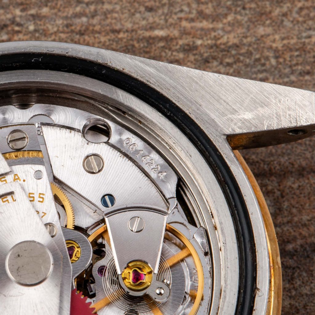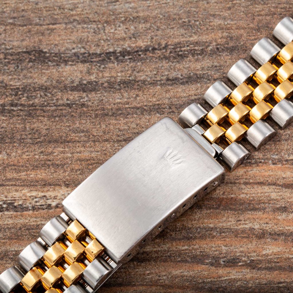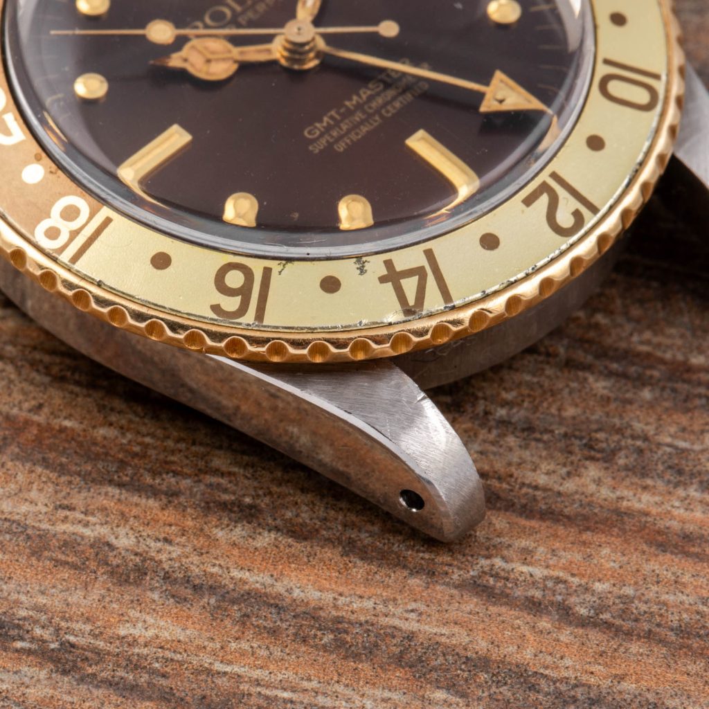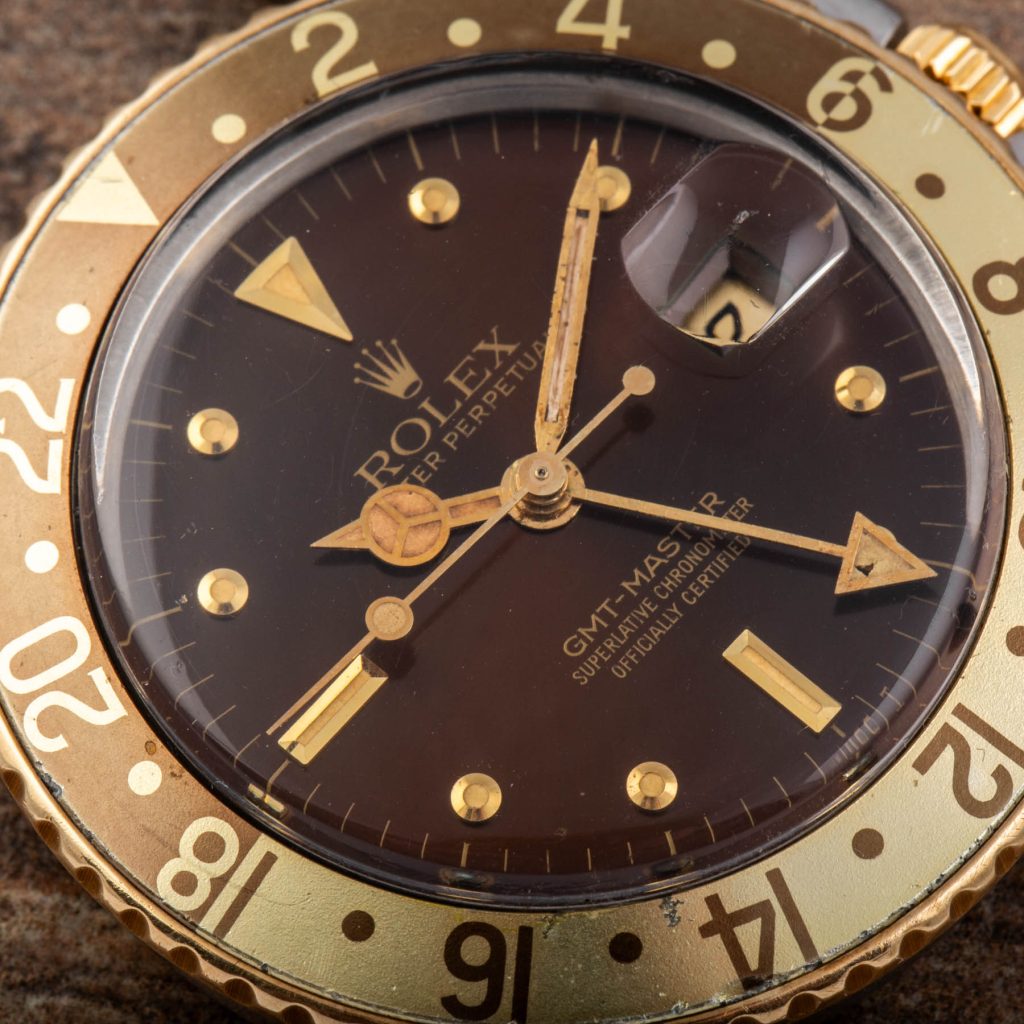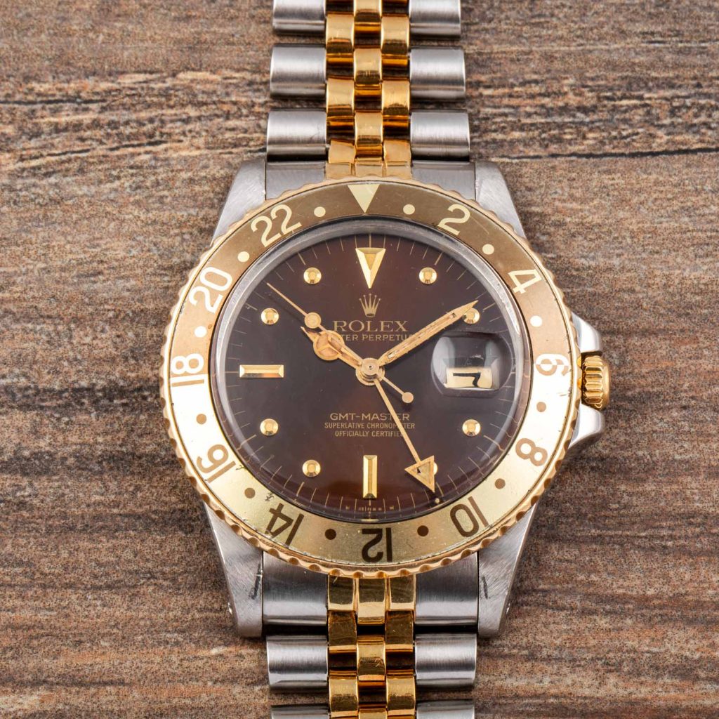 The present example is a highly attractive “Root Beer” configuration in stainless steel and yellow gold. It features the desirable brown dial with applied yellow gold “nipple” hour markers, whose raised conical shape adds depth and warmth, perfectly matching the gilt hands and brown and gold bezel insert. The overall aesthetic remains one of the most charismatic within the vintage GMT-Master family.